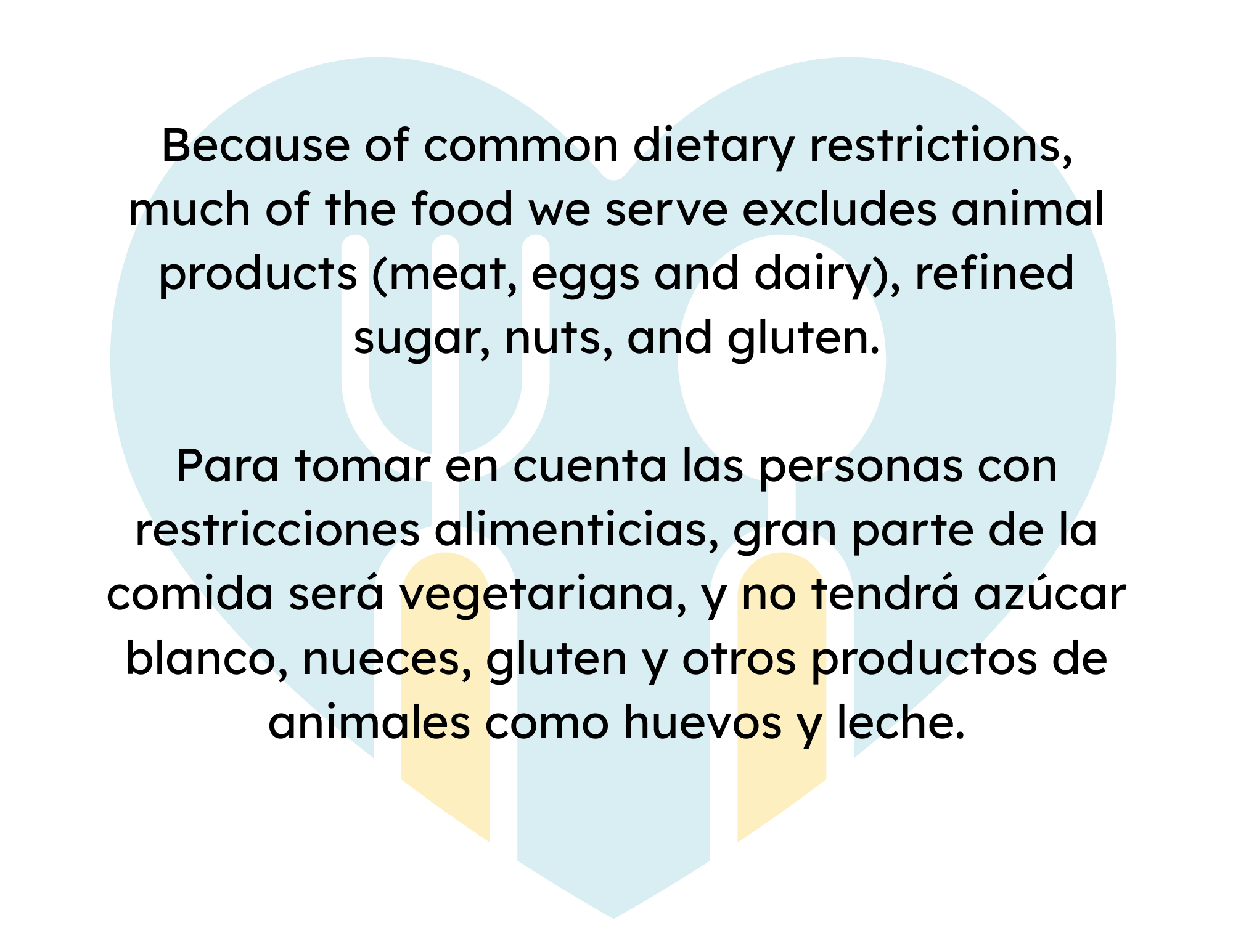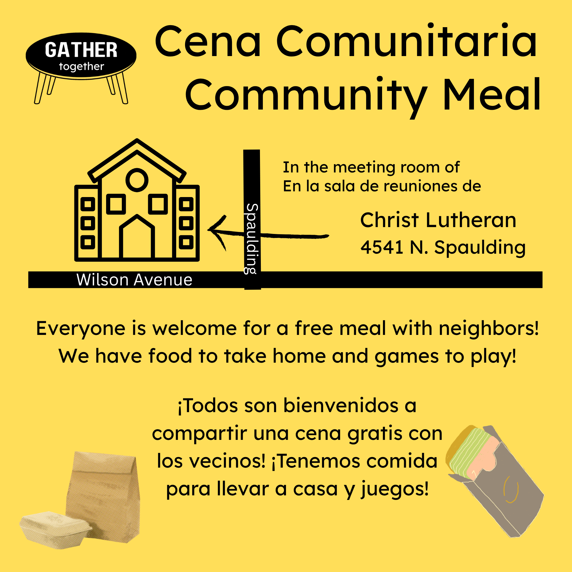 ¡Las cenas comunitarias son para todos y estan ubicadas en la sala de reuniones de la iglesia Christ Lutheran! ¡Nuestra próxima comida comunitaria estará el viernes, 8 de mayo, 5:30-7:00pm.