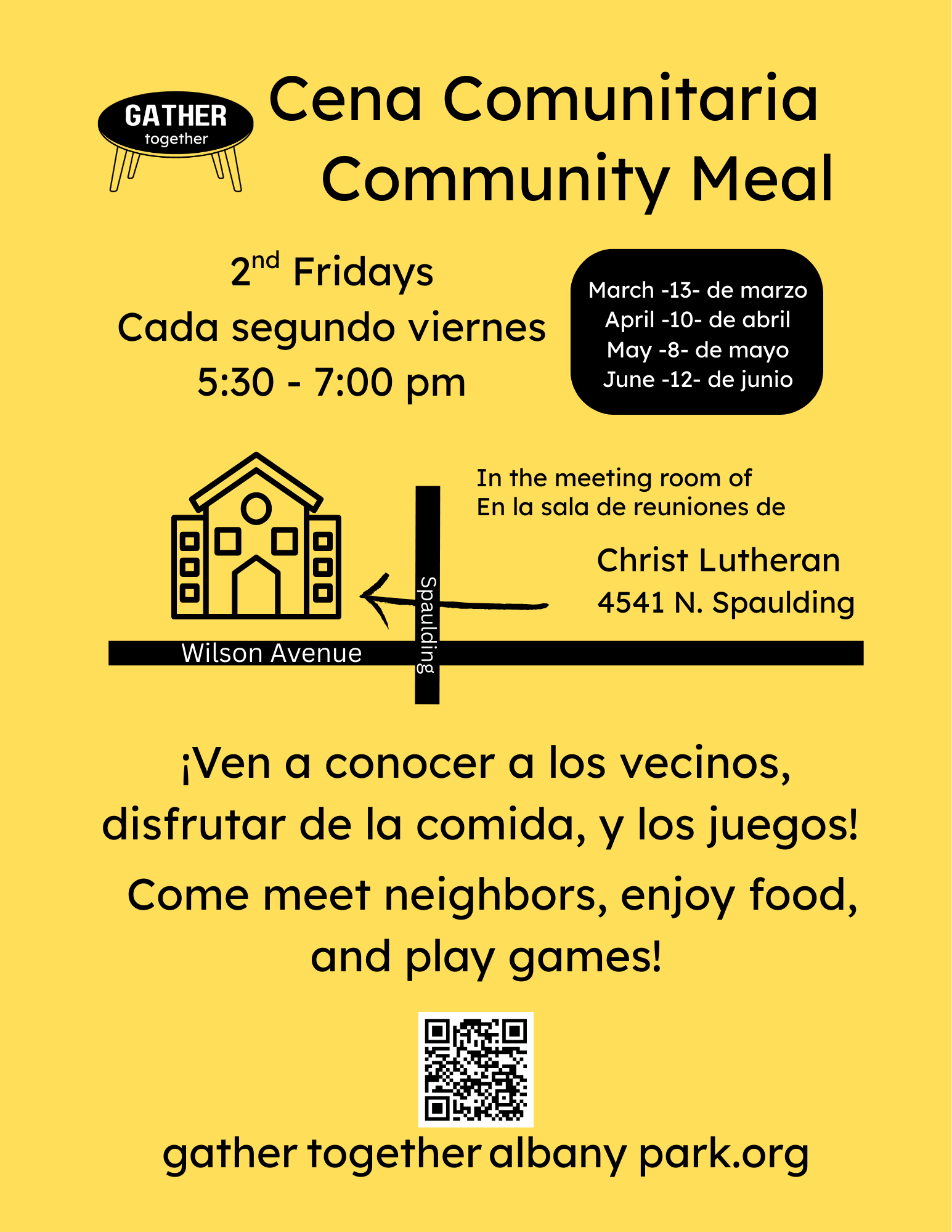 ¡Las cenas comunitarias estan gratis para todos y estan ubicadas en la sala de reuniones de la iglesia Christ Lutheran! ¡Nuestra próxima comida comunitaria estará el 10 de abril!